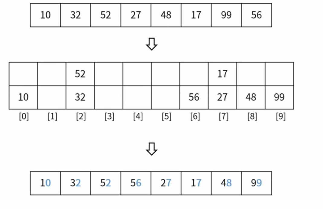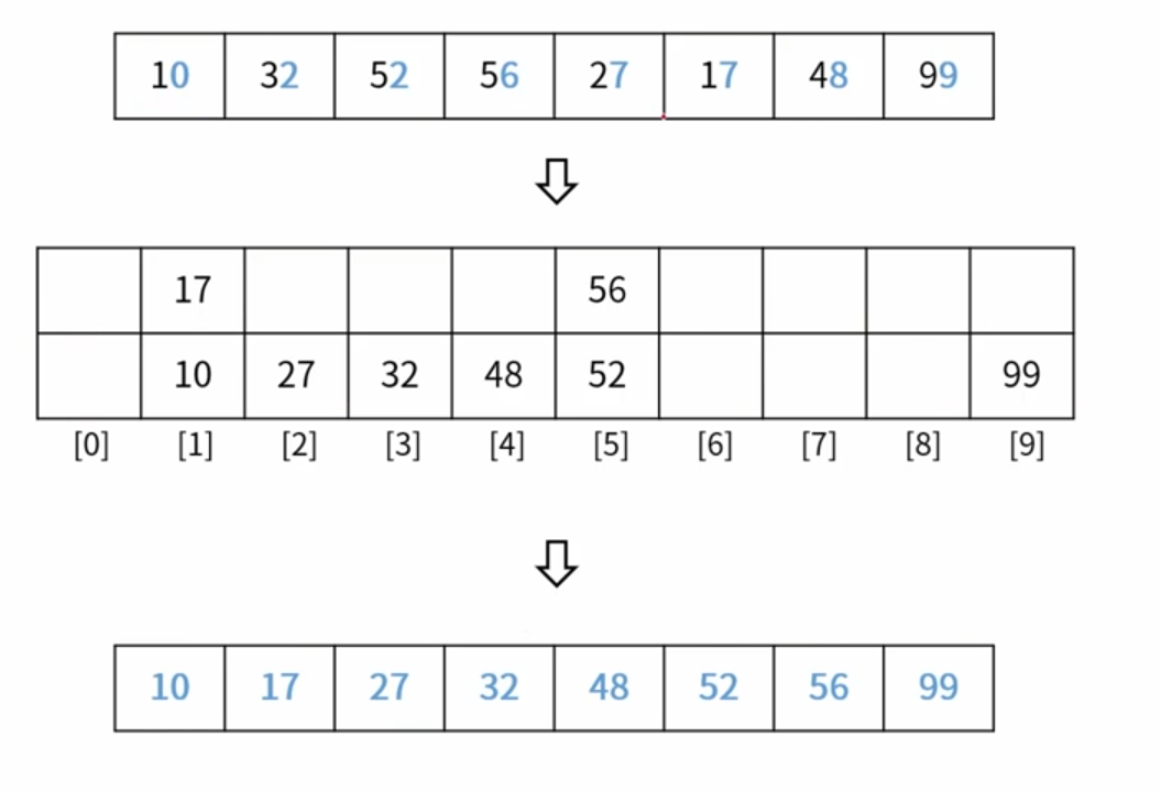 각 원소의 10의자리 숫자 만큼의 index를 List 또는 Queue에서 찾아 넣는다.