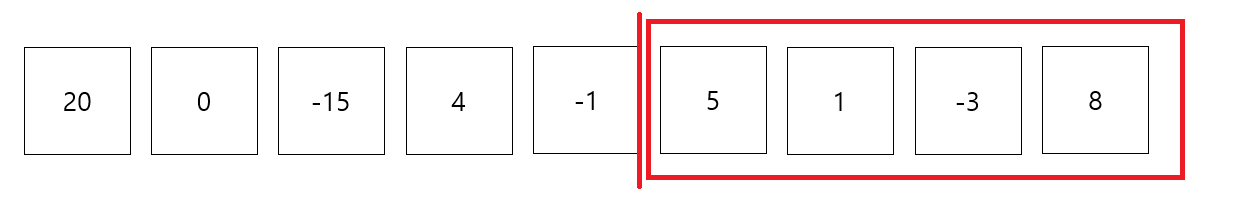 이렇게 구한 배열 조각 중 가장 큰 합을 갖는 조각이 우리가 찾고자 하는 부분 배열이다.