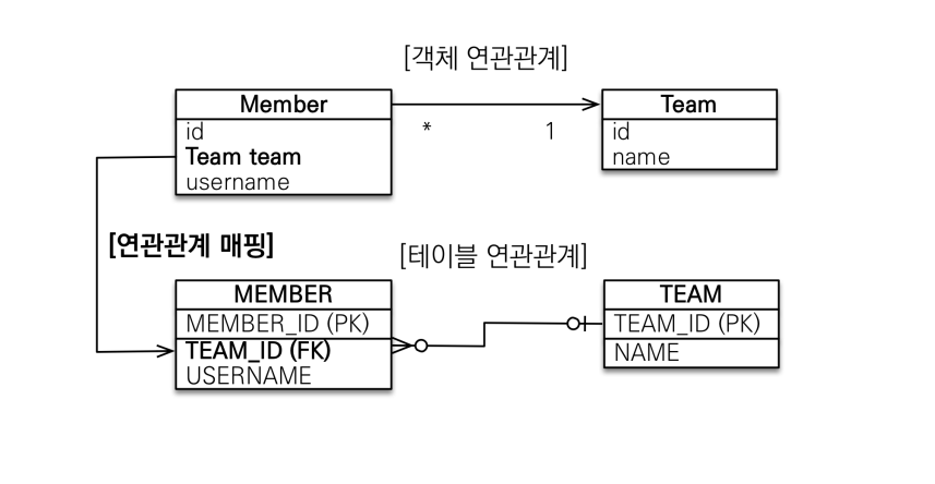 연관관계의 주인 개념 외래키를 관리할 객체를 말한다. 엔티티의 연관관계는 테이블에서와 객체에서 각각 존재한다. 테이블에서는 사실 연관관계의 주인이 누구건간에 테이블 구조는 똑같다.
