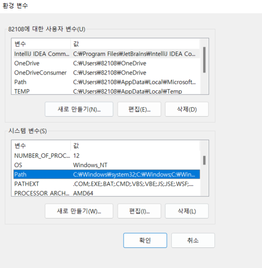 고급 시스템 설정 보기 (윈도우 11 기준) -> 환경변수로 들어간다.