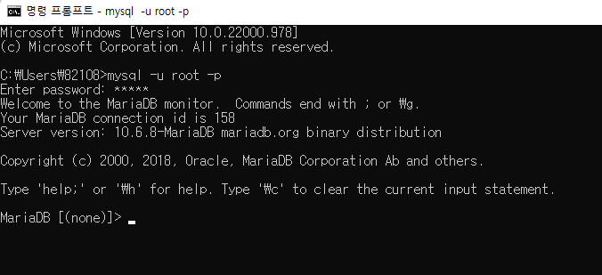 이후 확인을 눌러 창을 닫고 명령 프롬프트에서 접속해보면 잘 될 것이다.