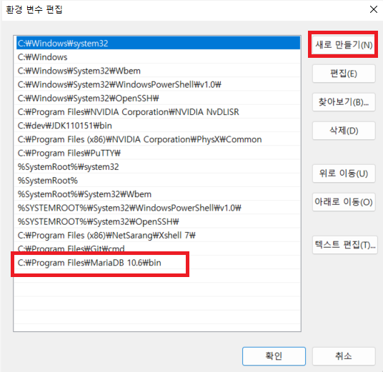Path 더블클릭 -> 새로만들기 -> MySQL 혹은 MariaDB의 bin 폴더 경로를 입력한다.