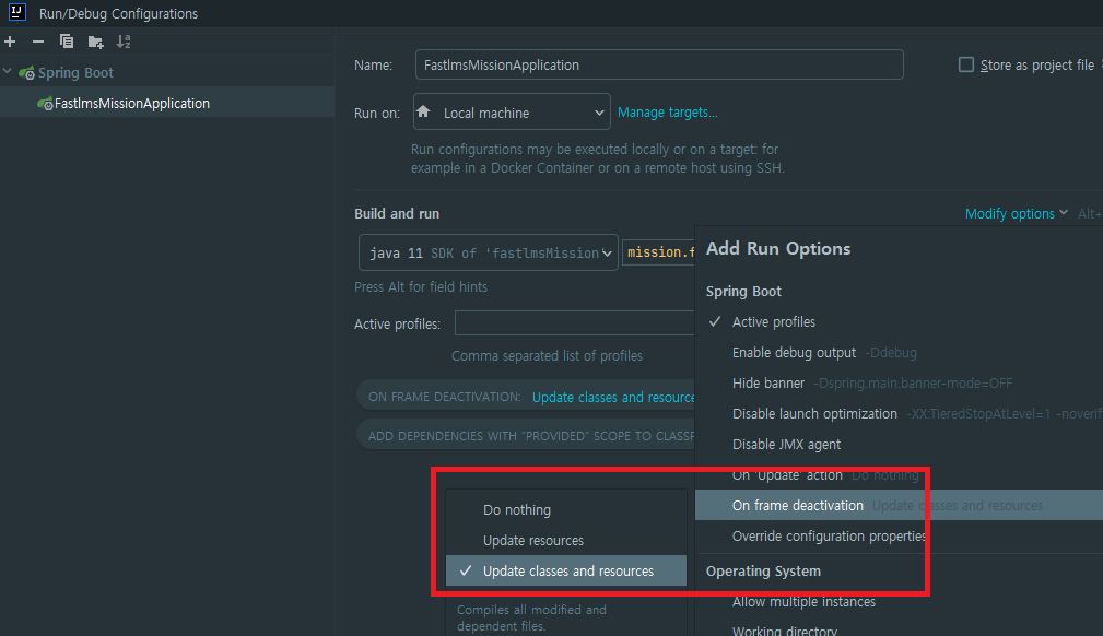 Run - EditConfigurations로 들어가서 Modify options을 누르고 On frame deactivation 설정을 사진처럼 바꿔주자.