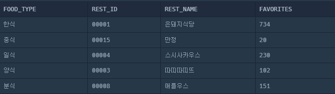 그리고 이제 이 정보를 토대로 위 FOOD_TYPE과 FAVORITES에 동시에 일치하는 ROW의 데이터를 조회하면 된다.